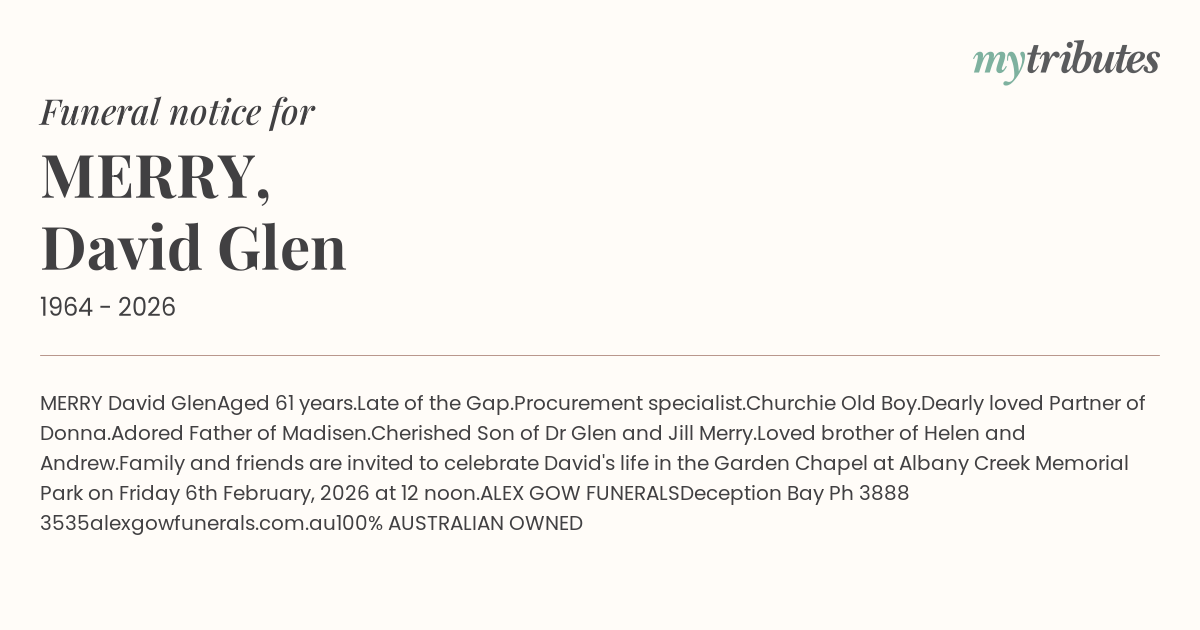 Family and friends are invited to celebrate David's life in the Garden Chapel at Albany Creek Memorial Park on Friday 6th February, 2026 at 12 noon.