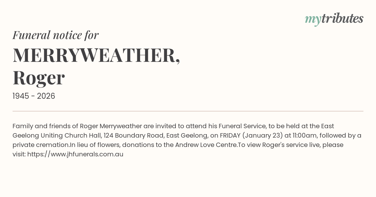 19°CFamily and friends of Roger Merryweather are invited to attend his Funeral Service, to be held at the East Geelong Uniting Church Hall, 124 Boundary Road, East Geelong, on FRIDAY (January 23) at 11:00am, followed by a private cremation.