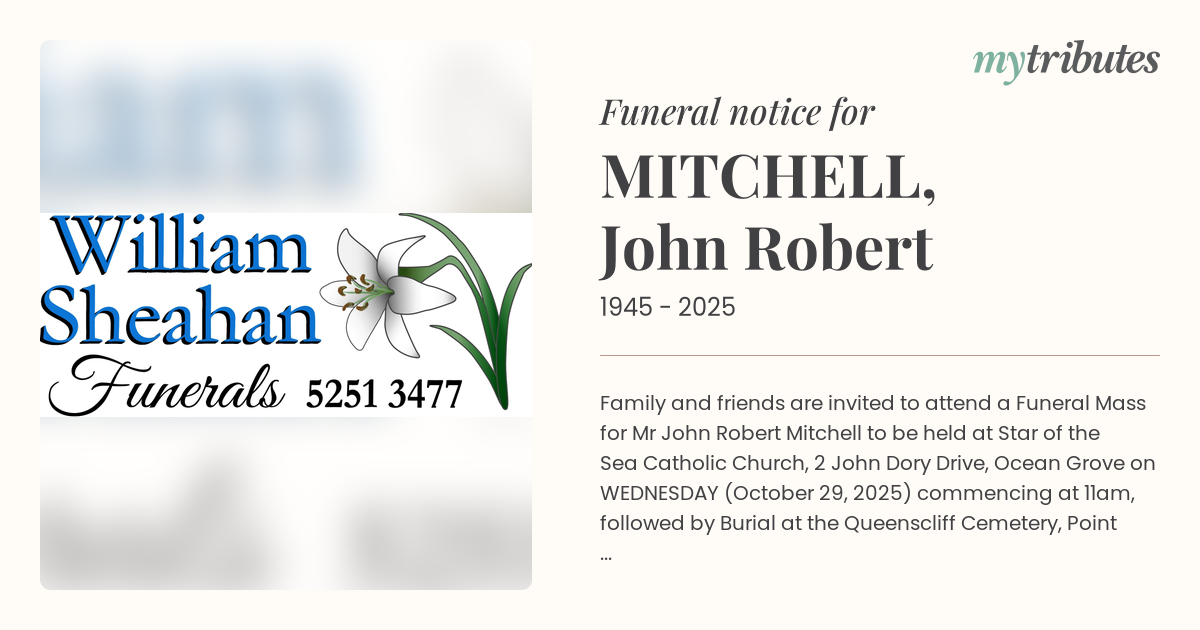 19°CFamily and friends are invited to attend a Funeral Mass for Mr John Robert Mitchell to be held at Star of the Sea Catholic Church, 2 John Dory Drive, Ocean Grove on WEDNESDAY (October 29, 2025) commencing at 11am, followed by Burial at the Queenscliff Cemetery, Point Lonsdale.