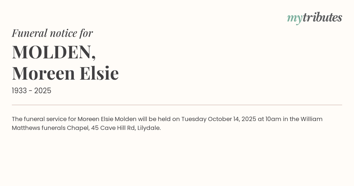 19°CThe funeral service for Moreen Elsie Molden will be held on Tuesday October 14, 2025 at 10am in the William Matthews funerals Chapel, 45 Cave Hill Rd, Lilydale.