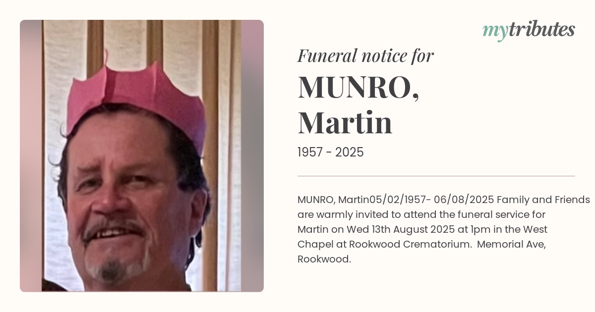 Family and Friends are warmly invited to attend the funeral service for Martin on Wed