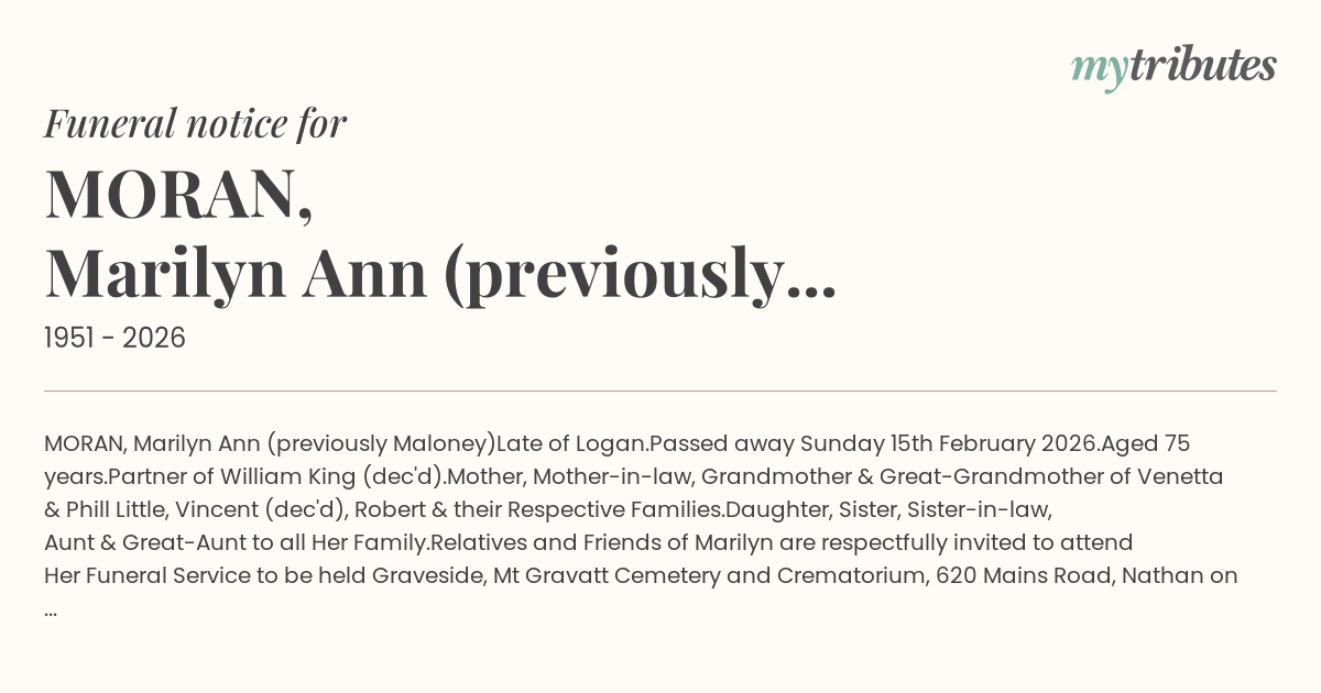 Relatives and Friends of Marilyn are respectfully invited to attend Her Funeral Service to be held Graveside, Mt Gravatt Cemetery and Crematorium, 620 Mains Road, Nathan on Friday 6th March 2026 at 11am.
