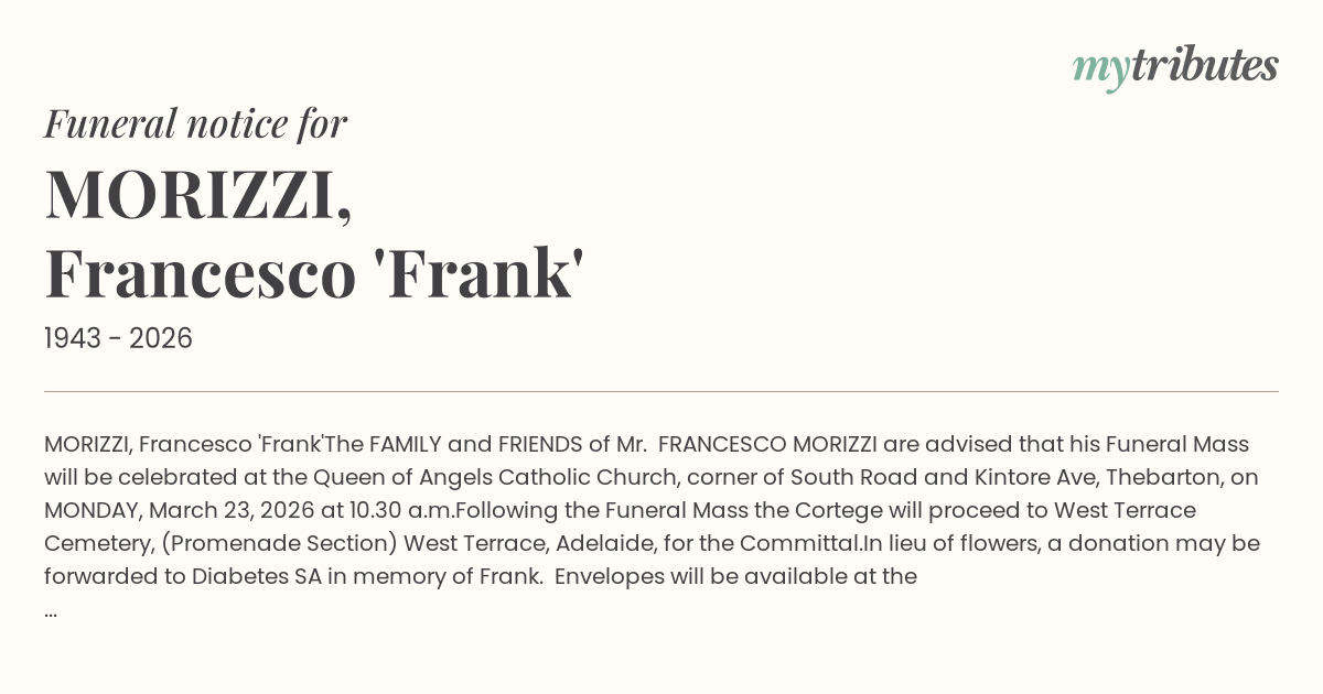 The FAMILY and FRIENDS of Mr. FRANCESCO MORIZZI are advised that his Funeral Mass will be celebrated at the Queen of Angels Catholic Church, corner of South Road and Kintore Ave, Thebarton, on MONDAY, March 23, 2026 at 10.30 a.m.