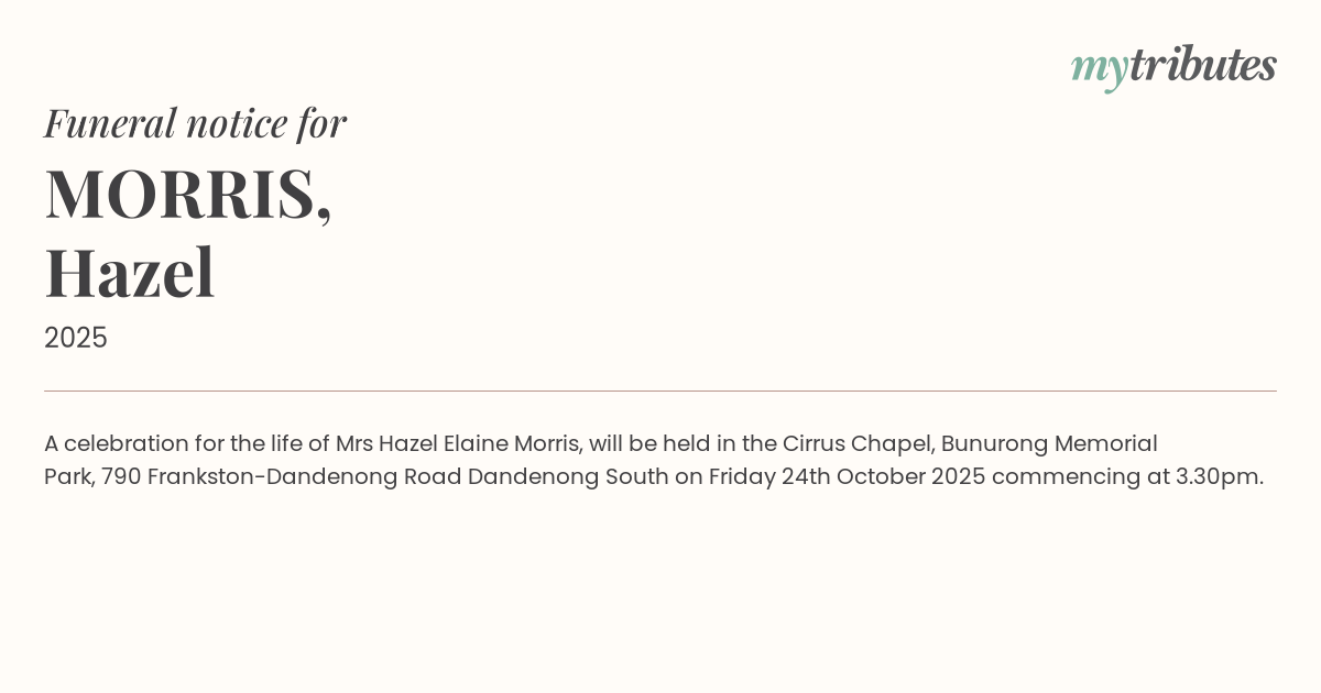 19°CA celebration for the life of Mrs Hazel Elaine Morris, will be held in the Cirrus Chapel, Bunurong Memorial Park, 790 Frankston-Dandenong Road Dandenong South on Friday 24th October 2025 commencing at 3.30pm.