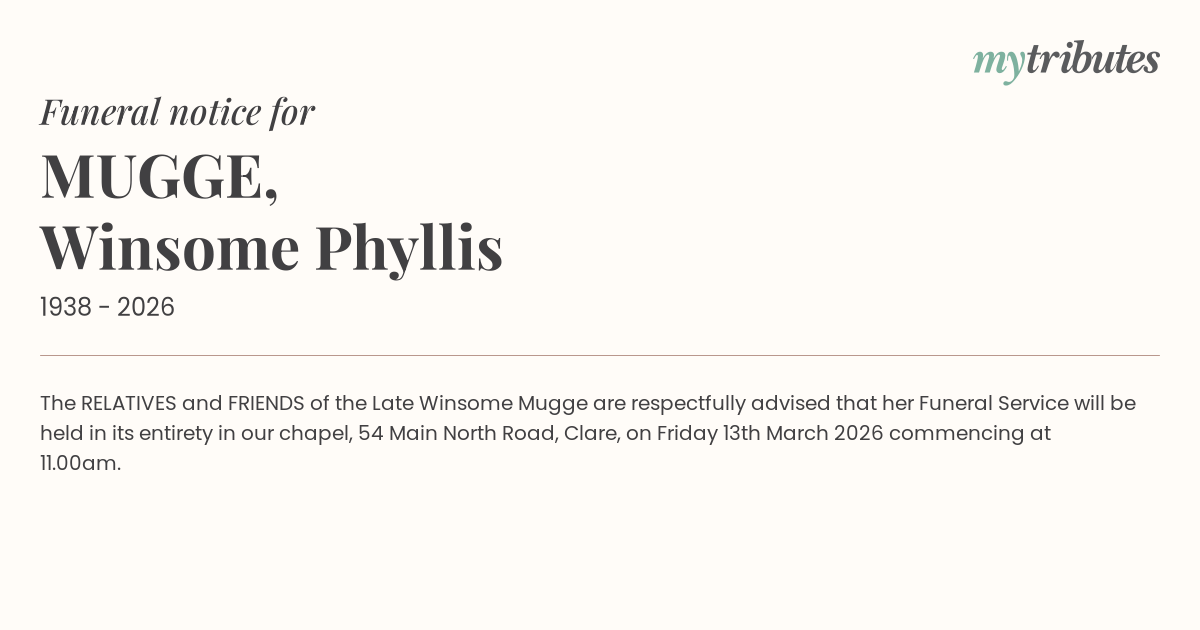 19°CThe RELATIVES and FRIENDS of the Late Winsome Mugge are respectfully advised that her Funeral Service will be held in its entirety in our chapel, 54 Main North Road, Clare, on Friday 13th March 2026 commencing at 11.00am.