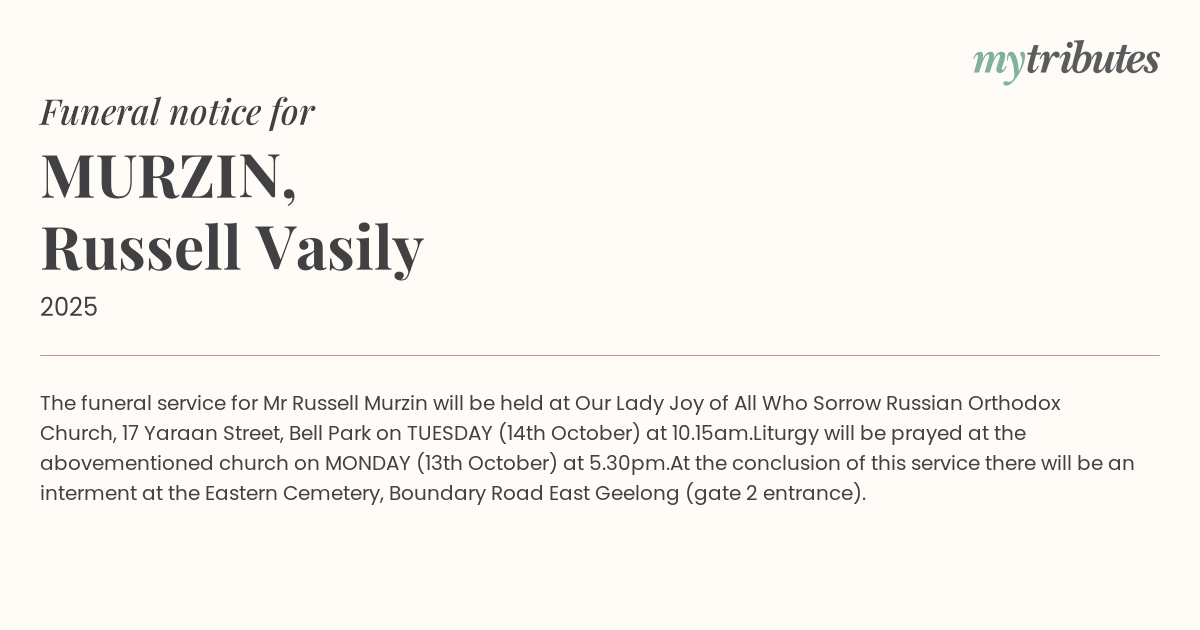 19°CThe funeral service for Mr Russell Murzin will be held at Our Lady Joy of All Who Sorrow Russian Orthodox Church, 17 Yaraan Street, Bell Park on TUESDAY (14th October) at 10.15am.