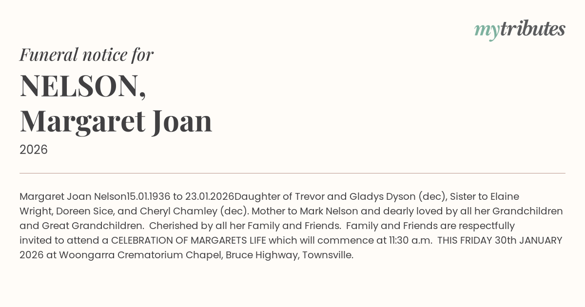 Family and Friends are respectfully invited to attend a CELEBRATION OF MARGARET’S LIFE which will commence at 11:30 a.m. THIS FRIDAY 30th JANUARY 2026 at Woongarra Crematorium Chapel, Bruce Highway, Townsville.