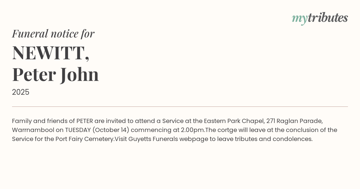 19°CFamily and friends of PETER are invited to attend a Service at the Eastern Park Chapel, 271 Raglan Parade, Warrnambool on TUESDAY (October 14) commencing at 2.00pm.