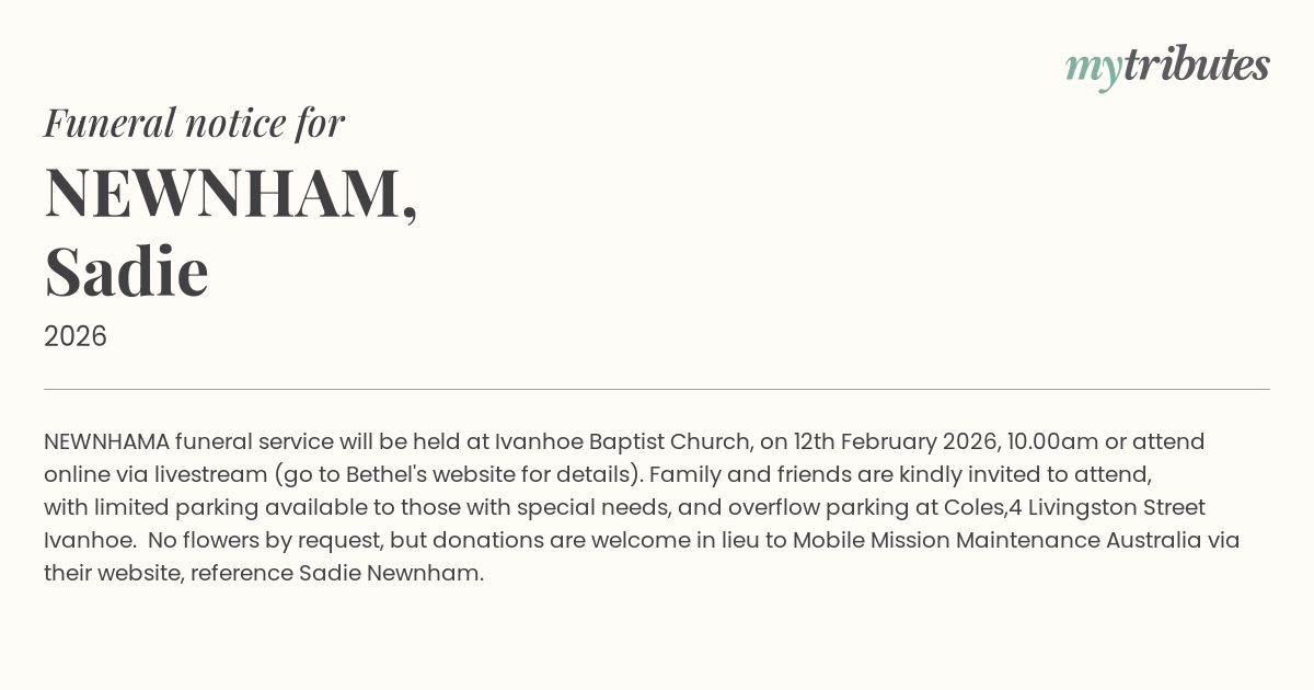 A funeral service will be held at Ivanhoe Baptist Church, on 12th February 2026, 10.00am or attend online via livestream (go to Bethel's website for details). Family and friends are kindly invited to attend, with limited parking available to those with special needs, and overflow parking at Coles,