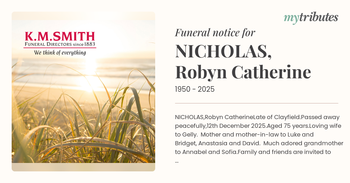 Family and friends are invited to attend a funeral service for Robyn, to be held at Holy Spirit Catholic Church, 16 Villiers Street, New Farm, on Tuesday, 23rd December 2025, commencing at 10:30 am.