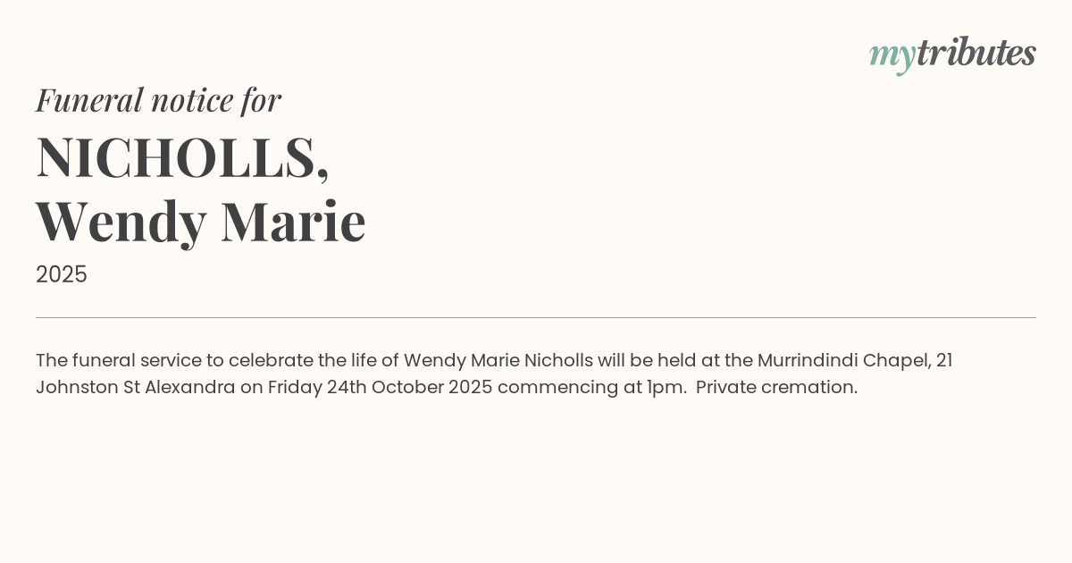 19°CThe funeral service to celebrate the life of Wendy Marie Nicholls will be held at the Murrindindi Chapel, 21 Johnston St Alexandra on Friday 24th October 2025 commencing at 1pm. Private cremation.