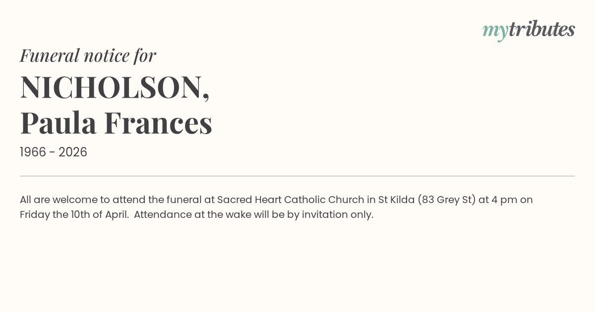 19°CAll are welcome to attend the funeral at Sacred Heart Catholic Church in St Kilda (83 Grey St) at 4 pm on Friday the 10th of April. Attendance at the wake will be by invitation only.