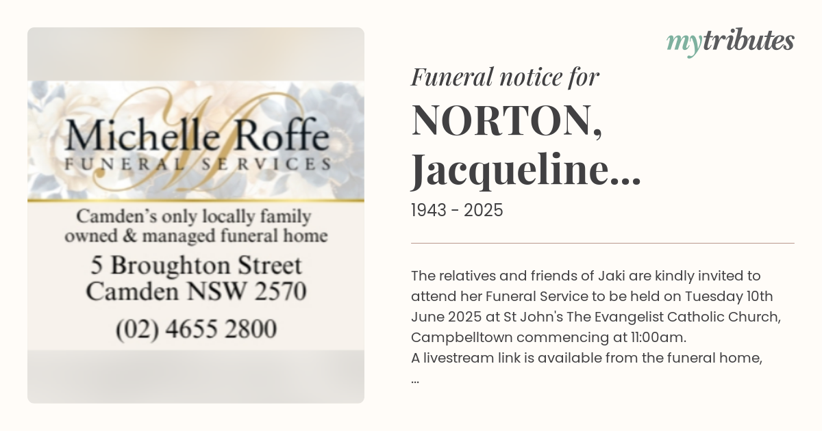 19°CThe relatives and friends of Jaki are kindly invited to attend her Funeral Service to be held on Tuesday 10th June 2025 at St John's The Evangelist Catholic Church, Campbelltown commencing at 11:00am. A livestream link is available from the funeral home, please contact them for details. In lieu of flowers, donations can be made at the time of service or Online to Kidney Health Australia.