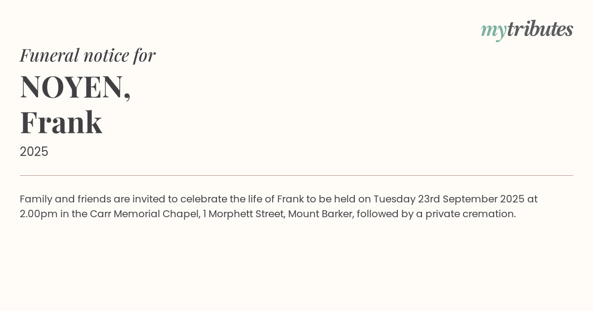 19°CFamily and friends are invited to celebrate the life of Frank to be held on Tuesday 23rd September 2025 at 2.00pm in the Carr Memorial Chapel, 1 Morphett Street, Mount Barker, followed by a private cremation.