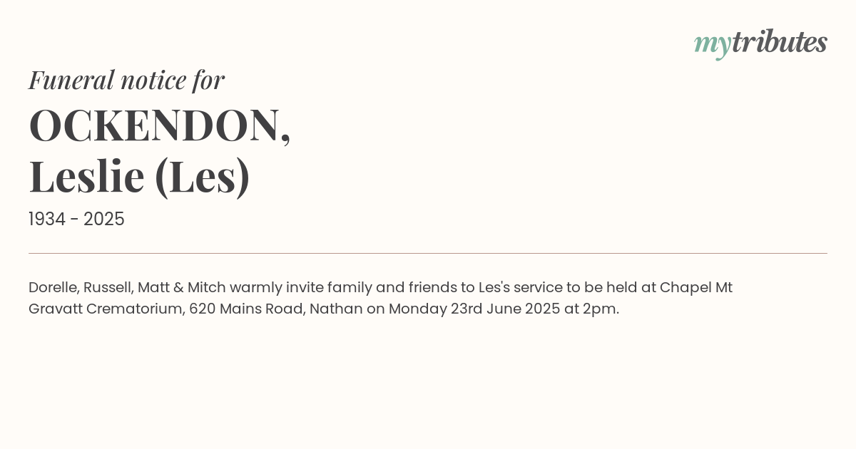 19°CDorelle, Russell, Matt & Mitch warmly invite family and friends to Les's service to be held at Chapel Mt Gravatt Crematorium, 620 Mains Road, Nathan on Monday 23rd June 2025 at 2pm.