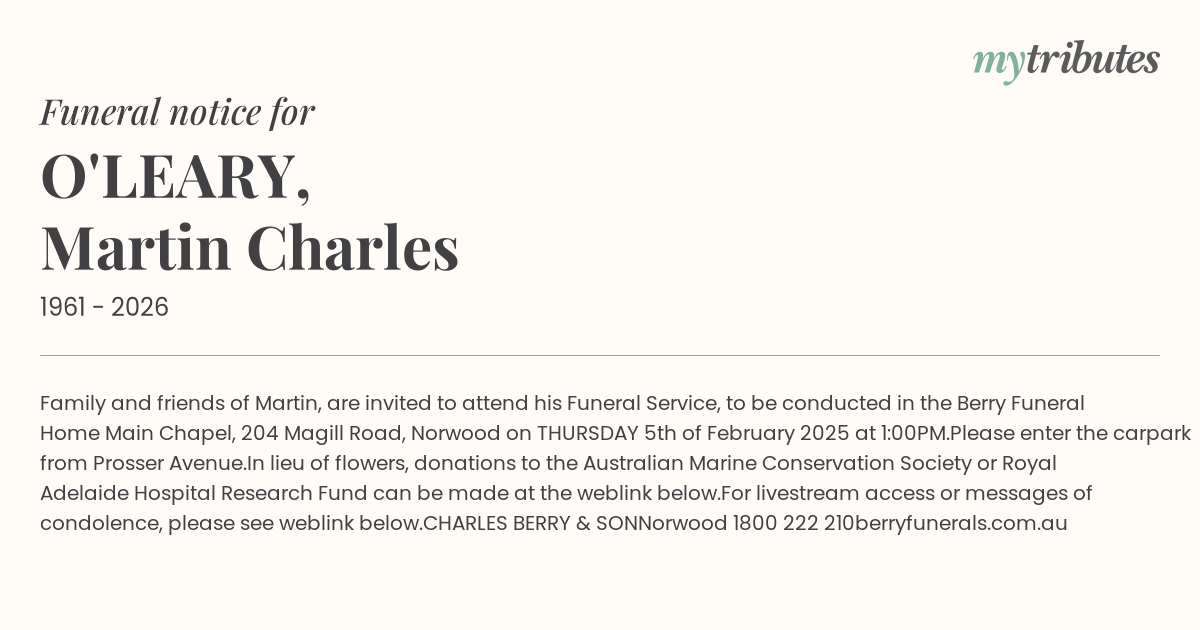 19°CFamily and friends of Martin, are invited to attend his Funeral Service, to be conducted in the Berry Funeral Home Main Chapel, 204 Magill Road, Norwood on THURSDAY 5th of February 2025 at 1:00PM.