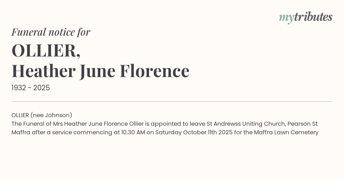 The Funeral of Mrs Heather June Florence Ollier is appointed to leave St Andrews’s Uniting Church, Pearson St Maffra after a service commencing at 10.30 AM on Saturday October 11th 2025 for the Maffra Lawn Cemetery