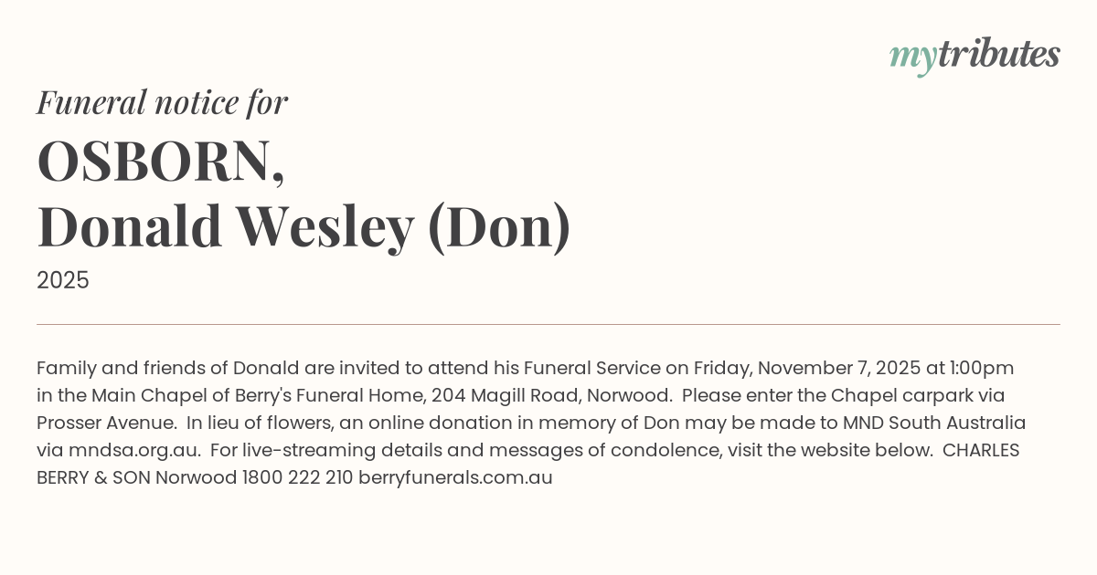 19°CFamily and friends of Donald are invited to attend his Funeral Service on Friday, November 7, 2025 at 1:00pm in the Main Chapel of Berry's Funeral Home, 204 Magill Road, Norwood.