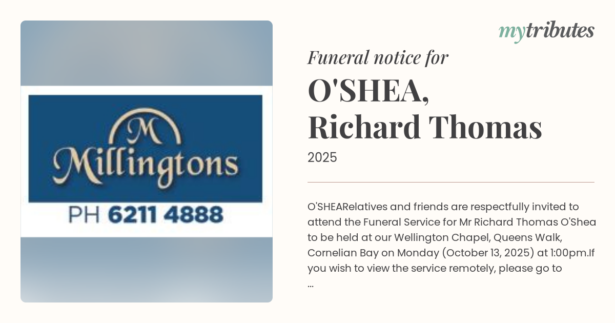 Relatives and friends are respectfully invited to attend the Funeral Service for Mr Richard Thomas O'Shea to be held at our Wellington Chapel, Queens Walk, Cornelian Bay on Monday (October 13, 2025) at 1:00pm.If you wish to view the service remotely, please go to millingtons.com.au/