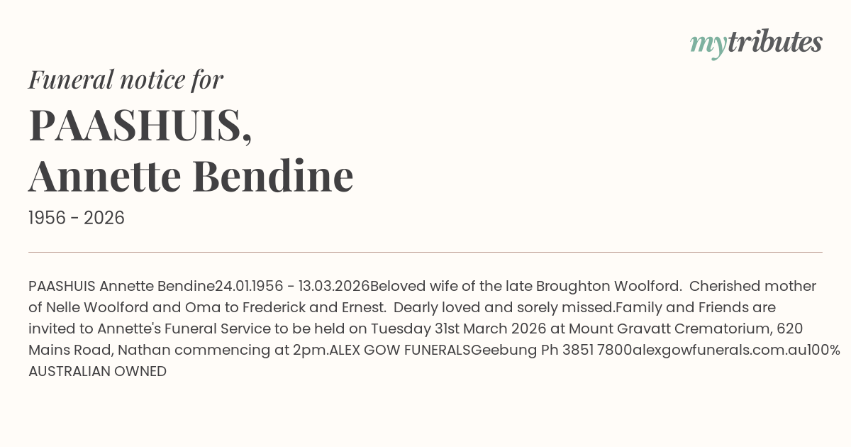 Family and Friends are invited to Annette's Funeral Service to be held on Tuesday 31st March 2026 at Mount Gravatt Crematorium, 620 Mains Road, Nathan commencing at 2pm.