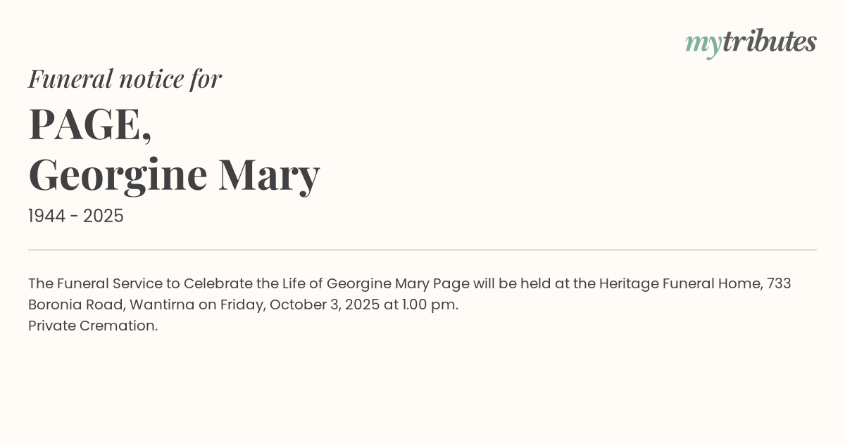 19°CThe Funeral Service to Celebrate the Life of Georgine Mary Page will be held at the Heritage Funeral Home, 733 Boronia Road, Wantirna on Friday, October 3, 2025 at 1.00 pm.