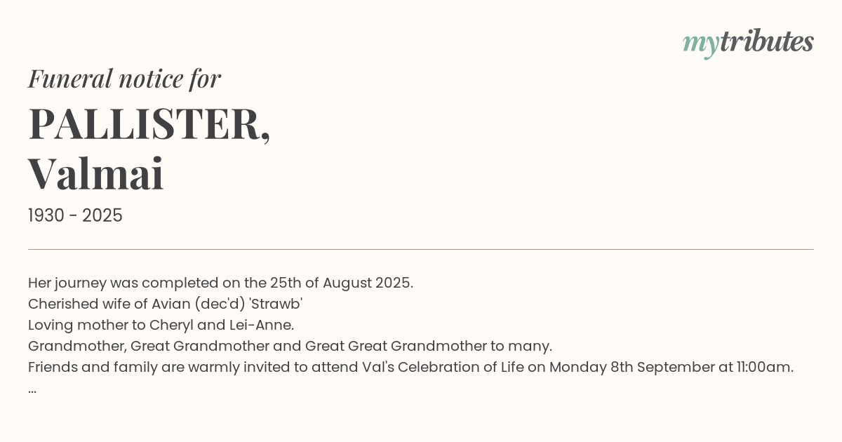 Friends and family are warmly invited to attend Val's Celebration of Life on Monday 8th September at 11:00am.