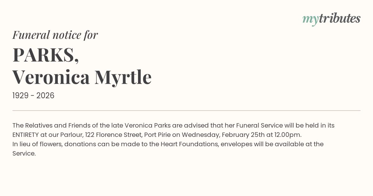 19°CThe Relatives and Friends of the late Veronica Parks are advised that her Funeral Service will be held in its ENTIRETY at our Parlour, 122 Florence Street, Port Pirie on Wednesday, February 25th at 12.00pm.