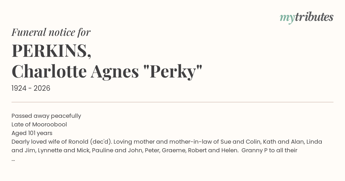 Dearly loved wife of Ronold (dec'd). Loving mother and mother-in-law of Sue and Colin, Kath and Alan, Linda and Jim, Lynnette and Mick, Pauline and John, Peter, Graeme, Robert and Helen. Granny P to all their families.
