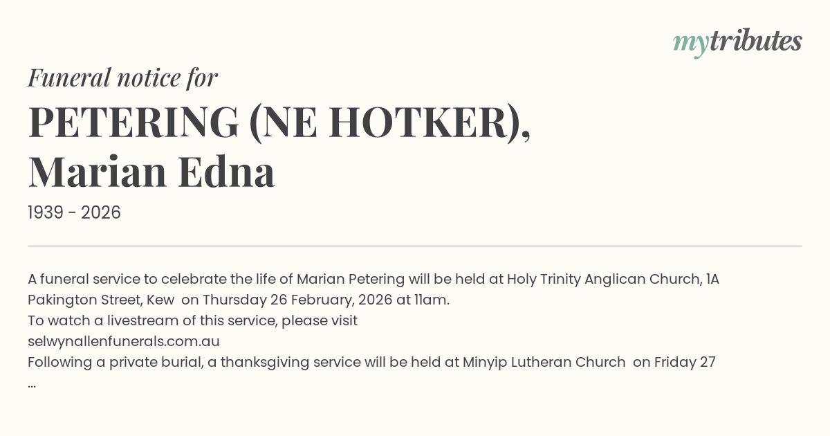 19°CA funeral service to celebrate the life of Marian Petering will be held at Holy Trinity Anglican Church, 1A Pakington Street, Kew on Thursday 26 February, 2026 at 11am.