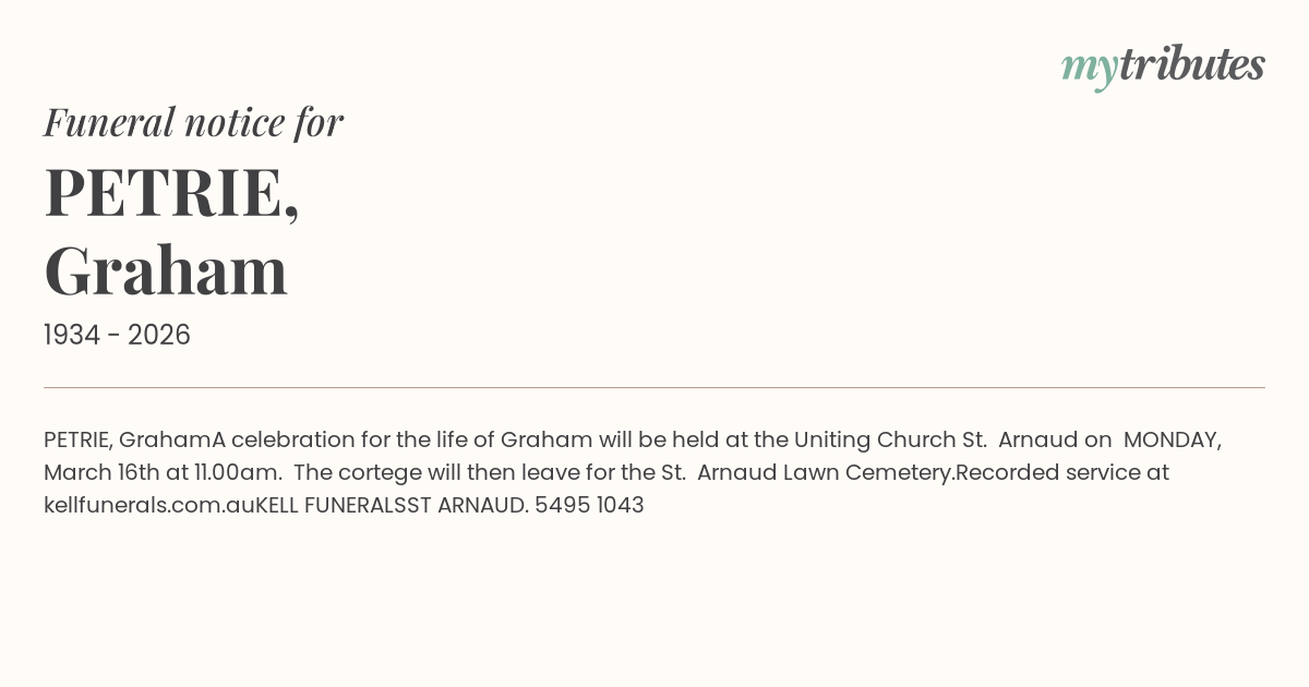 A celebration for the life of Graham will be held at the Uniting Church St. Arnaud on MONDAY, March 16th at 11.00am. The cortege will then leave for the St. Arnaud Lawn Cemetery.