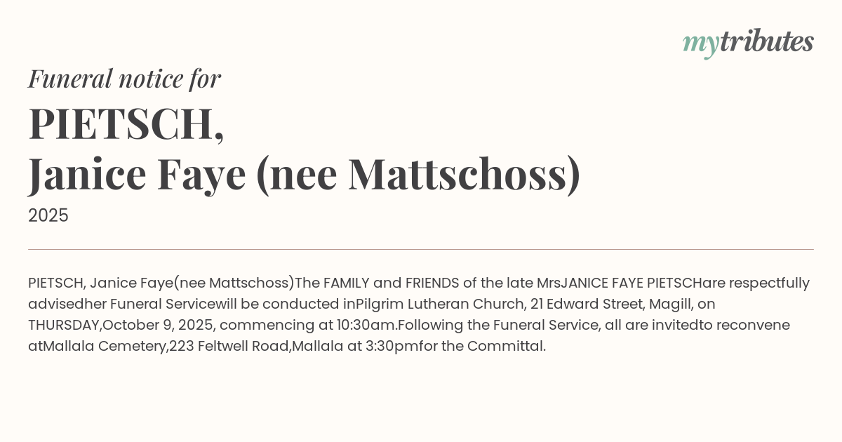 Pilgrim Lutheran Church, 21 Edward Street, Magill, on THURSDAY,