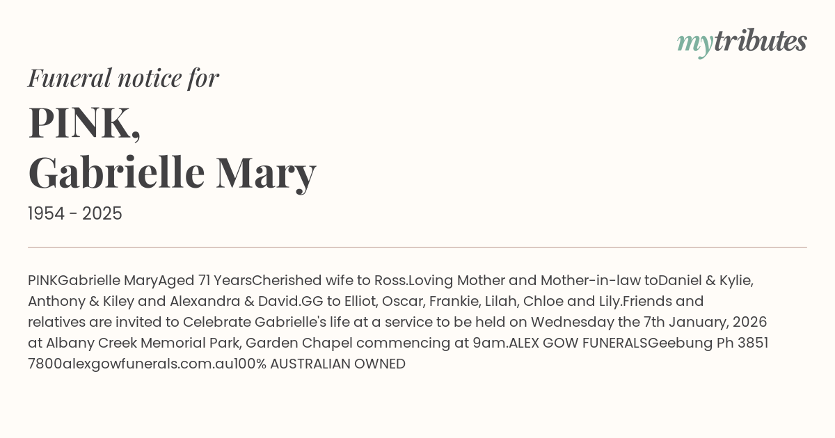 Friends and relatives are invited to Celebrate Gabrielle's life at a service to be held on Wednesday the 7th January, 2026 at Albany Creek Memorial Park, Garden Chapel commencing at 9am.