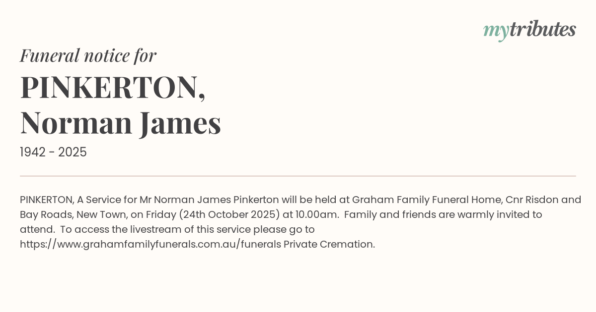 19°CPINKERTON, A Service for Mr Norman James Pinkerton will be held at Graham Family Funeral Home, Cnr Risdon and Bay Roads, New Town, on Friday (24th October 2025) at 10.00am. Family and friends are warmly invited to attend. To access the livestream of this service please go to https://www.grahamfamilyfunerals.com.au/funerals Private Cremation.