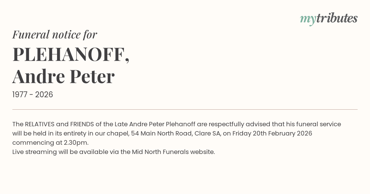 19°CThe RELATIVES and FRIENDS of the Late Andre Peter Plehanoff are respectfully advised that his funeral service will be held in its entirety in our chapel, 54 Main North Road, Clare SA, on Friday 20th February 2026 commencing at 2.30pm.