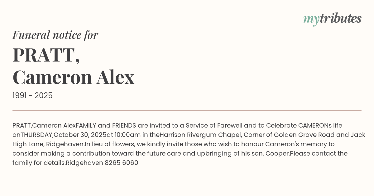 In lieu of flowers, we kindly invite those who wish to honour Cameron's memory to consider making a contribution toward the future care and upbringing of his son, Cooper.