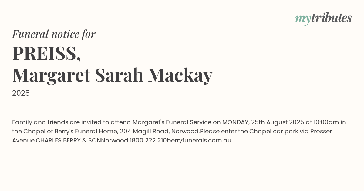 19°CFamily and friends are invited to attend Margaret's Funeral Service on MONDAY, 25th August 2025 at 10:00am in the Chapel of Berry's Funeral Home, 204 Magill Road, Norwood.