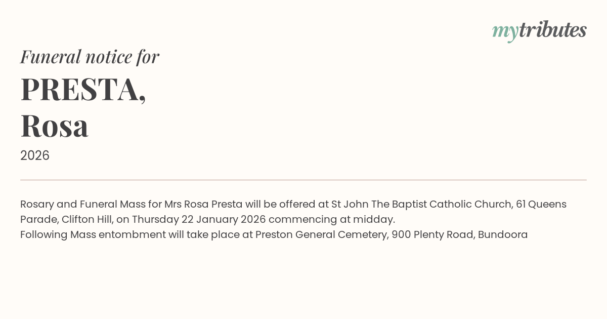19°CRosary and Funeral Mass for Mrs Rosa Presta will be offered at St John The Baptist Catholic Church, 61 Queens Parade, Clifton Hill, on Thursday 22 January 2026 commencing at midday.