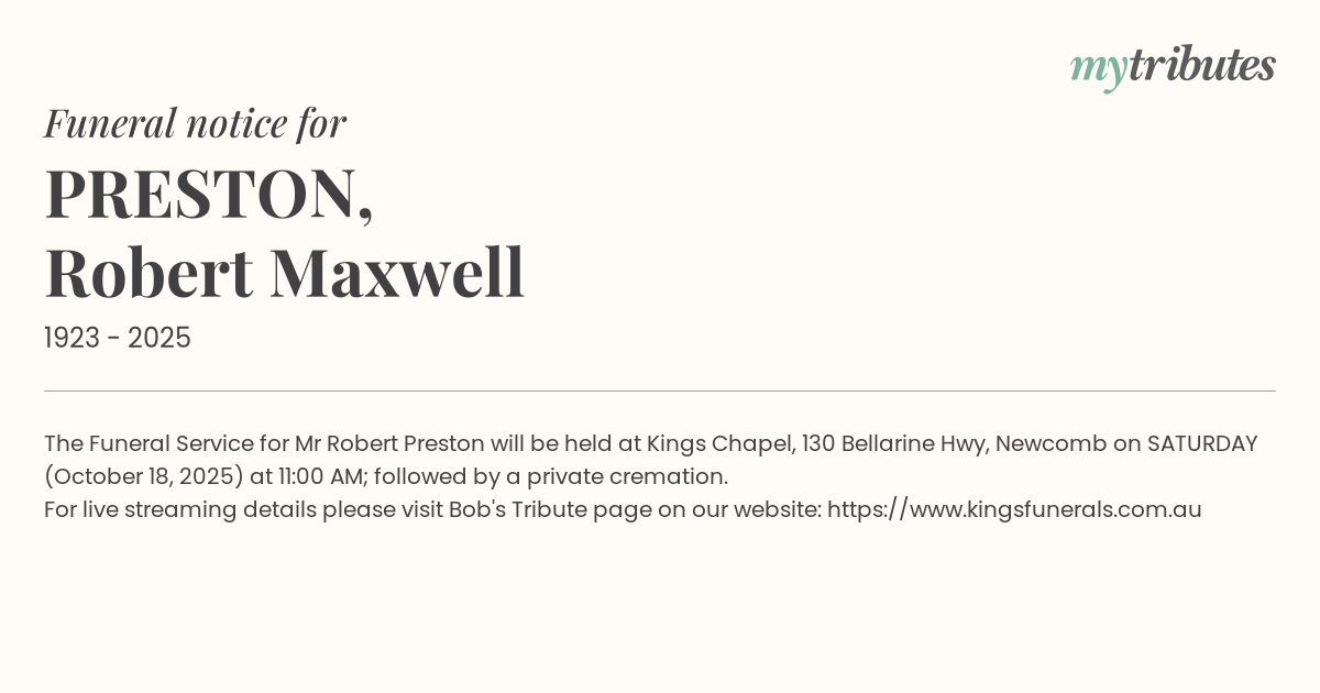 19°CThe Funeral Service for Mr Robert Preston will be held at Kings Chapel, 130 Bellarine Hwy, Newcomb on SATURDAY (October 18, 2025) at 11:00 AM; followed by a private cremation.