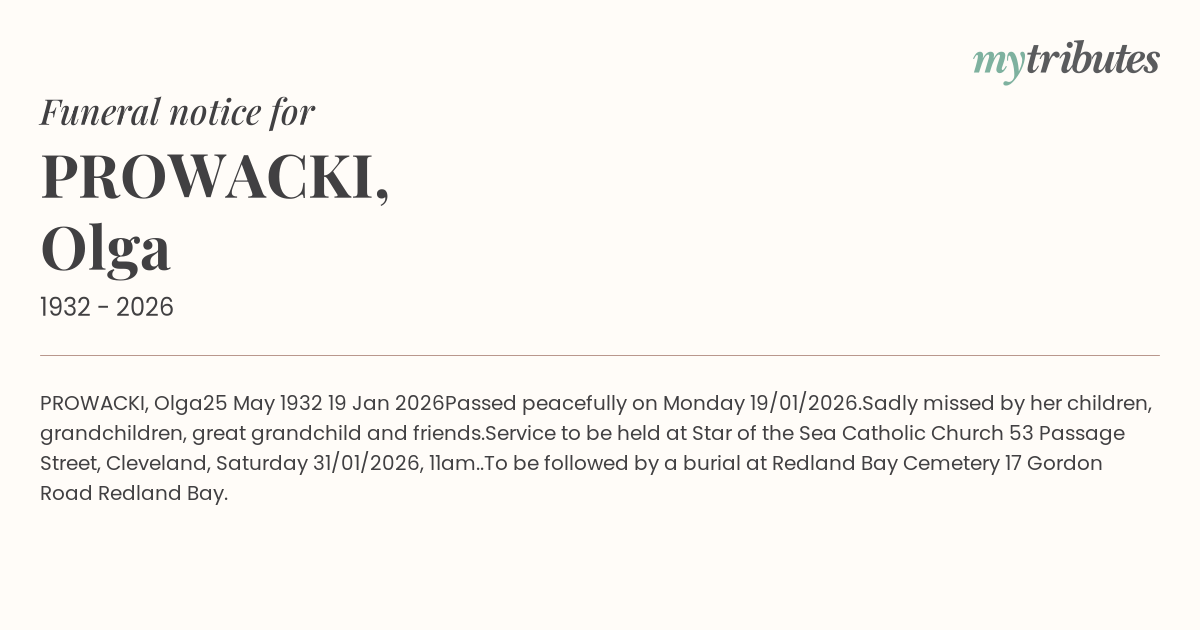 Sadly missed by her children, grandchildren, great grandchild and friends.