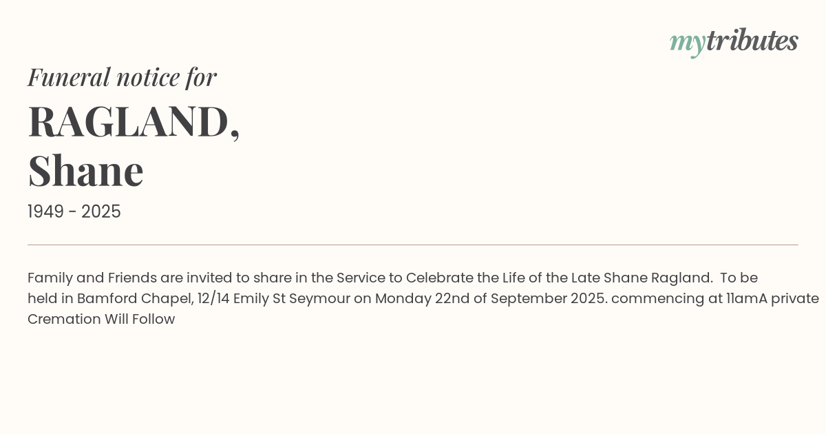 19°CFamily and Friends are invited to share in the Service to Celebrate the Life of the Late Shane Ragland.