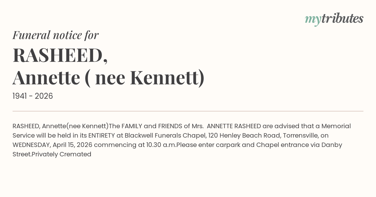 The FAMILY and FRIENDS of Mrs. ANNETTE RASHEED are advised that a Memorial Service will be held in its ENTIRETY at Blackwell Funerals Chapel, 120 Henley Beach Road, Torrensville, on WEDNESDAY, April 15, 2026 commencing at 10.30 a.m.
