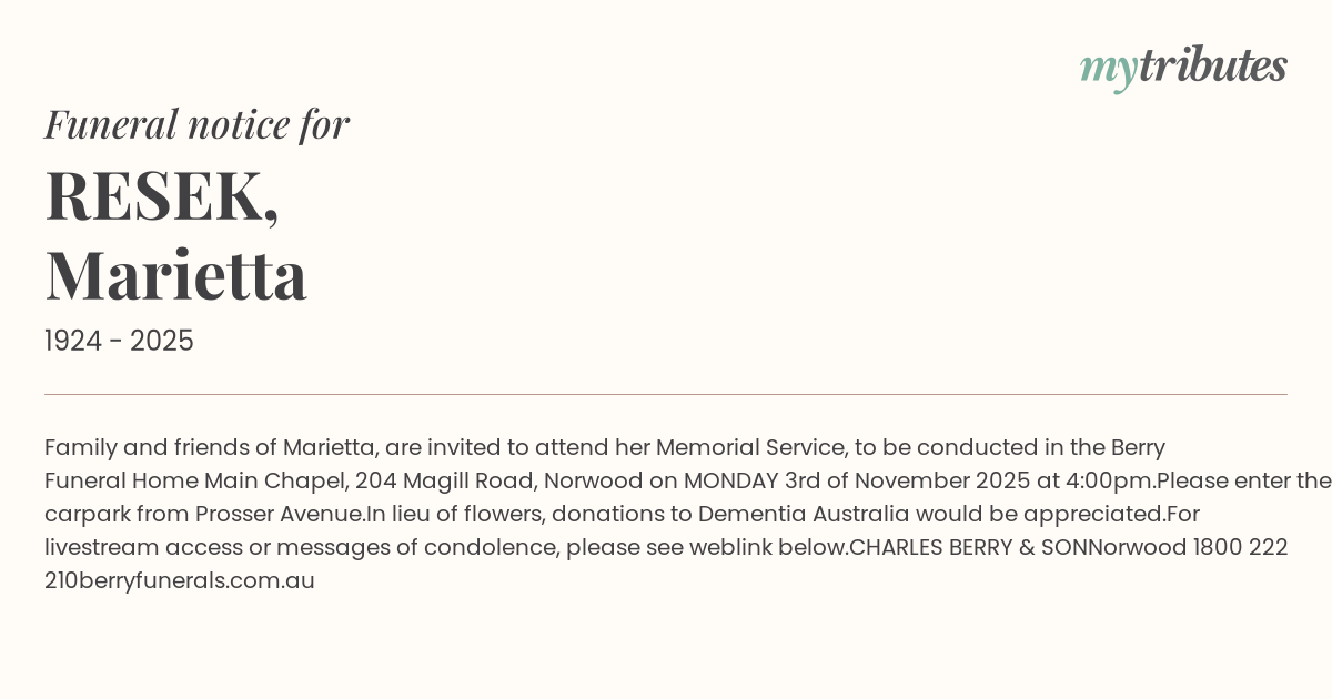 19°CFamily and friends of Marietta, are invited to attend her Memorial Service, to be conducted in the Berry Funeral Home Main Chapel, 204 Magill Road, Norwood on MONDAY 3rd of November 2025 at 4:00pm.