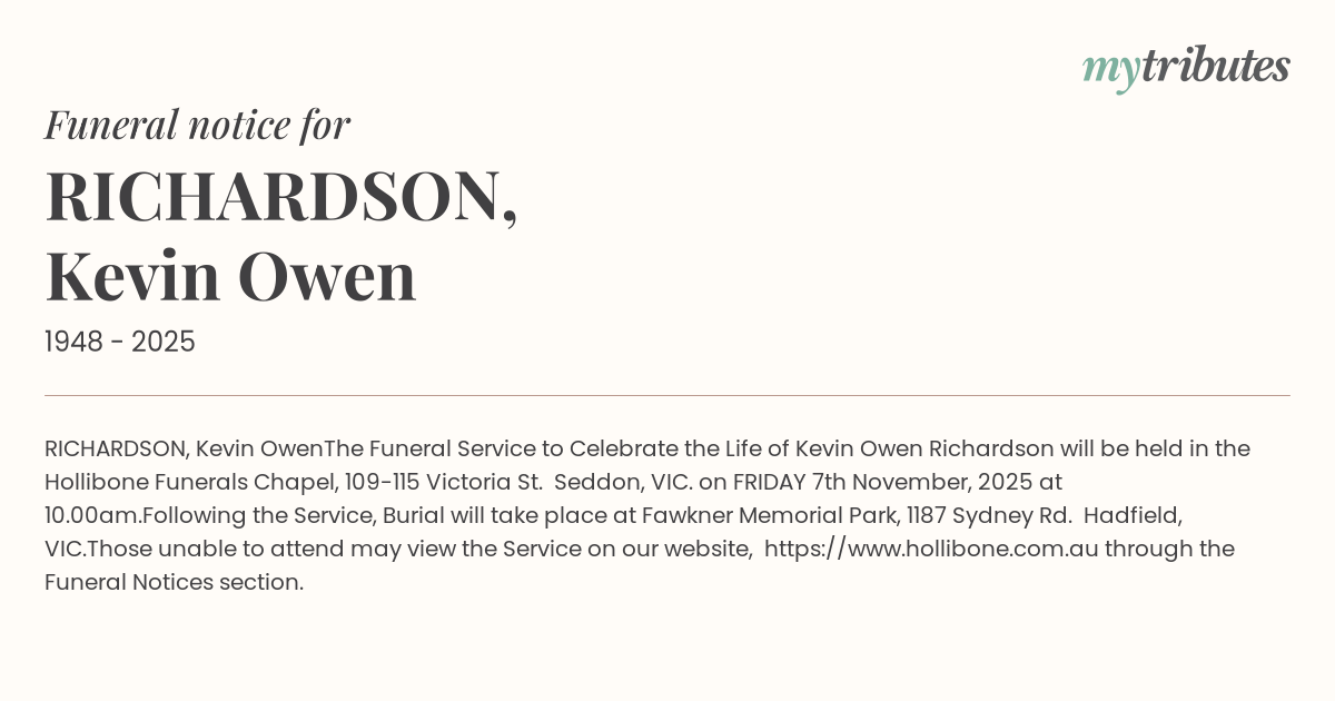 The Funeral Service to Celebrate the Life of Kevin Owen Richardson will be held in the Hollibone Funerals Chapel, 109-115 Victoria St. Seddon, VIC. on FRIDAY 7th November, 2025 at 10.00am.