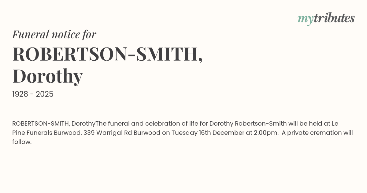 The funeral and celebration of life for Dorothy Robertson-Smith will be held at Le Pine Funerals Burwood, 339 Warrigal Rd Burwood on