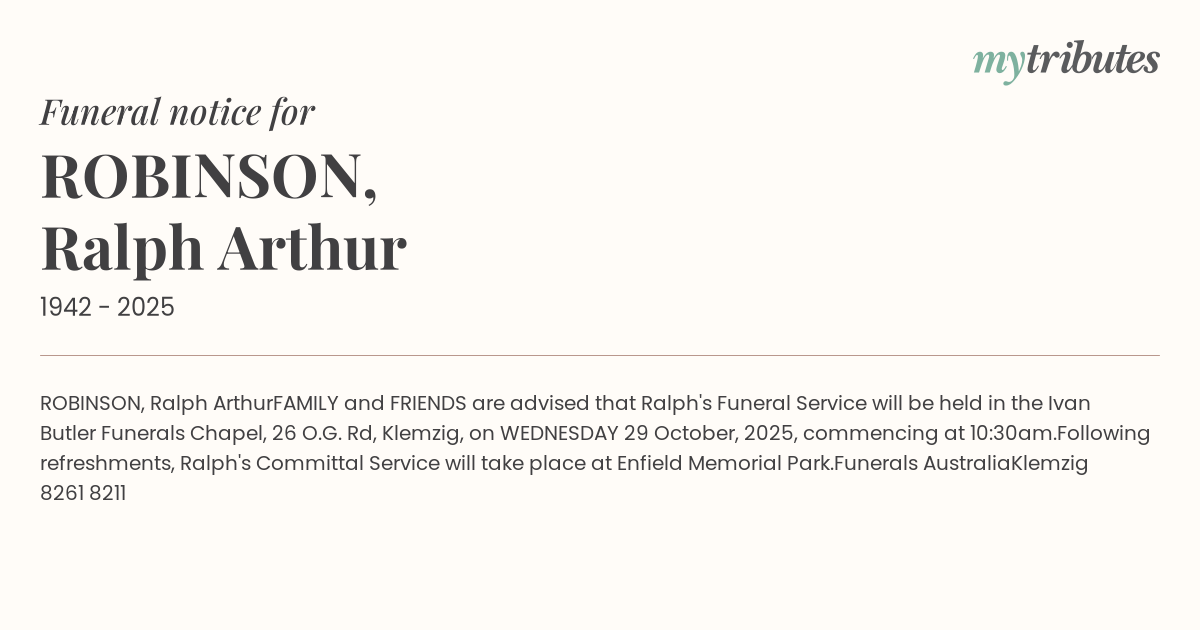 Ivan Butler Funerals Chapel, 26 O.G. Rd, Klemzig, on WEDNESDAY
