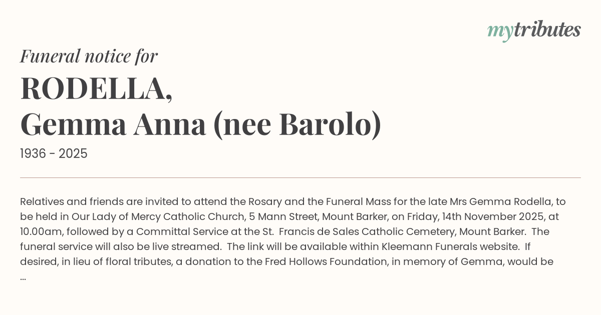 19°CRelatives and friends are invited to attend the Rosary and the Funeral Mass for the late Mrs Gemma Rodella, to be held in Our Lady of Mercy Catholic Church, 5 Mann Street, Mount Barker, on Friday, 14th November 2025, at 10.00am, followed by a Committal Service at the St. Francis de Sales Catholic Cemetery, Mount Barker. The funeral service will also be live streamed. The link will be available within Kleemann Funerals website. If desired, in lieu of floral tributes, a donation to the Fred Hollows Foundation, in memory of Gemma, would be greatly appreciated.