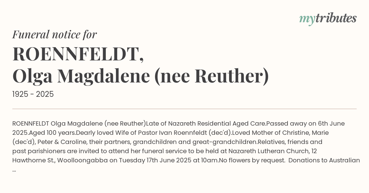 Relatives, friends and past parishioners are invited to attend her funeral service to be held at Nazareth Lutheran Church, 12 Hawthorne St., Woolloongabba on Tuesday 17th June 2025 at 10am.