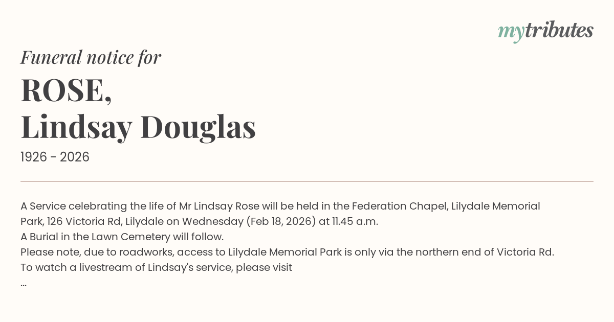 19°CA Service celebrating the life of Mr Lindsay Rose will be held in the Federation Chapel, Lilydale Memorial Park, 126 Victoria Rd, Lilydale on Wednesday (Feb 18, 2026) at 11.45 a.m.