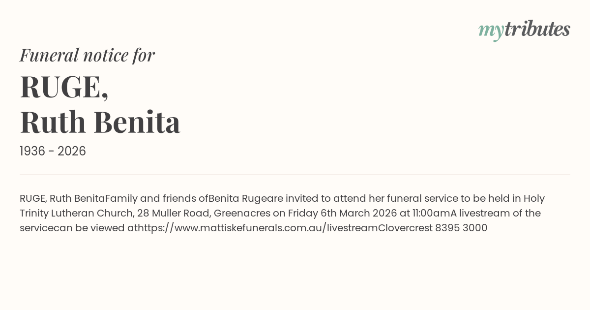 in Holy Trinity Lutheran Church, 28 Muller Road, Greenacres on Friday 6th March 2026 at 11:00am