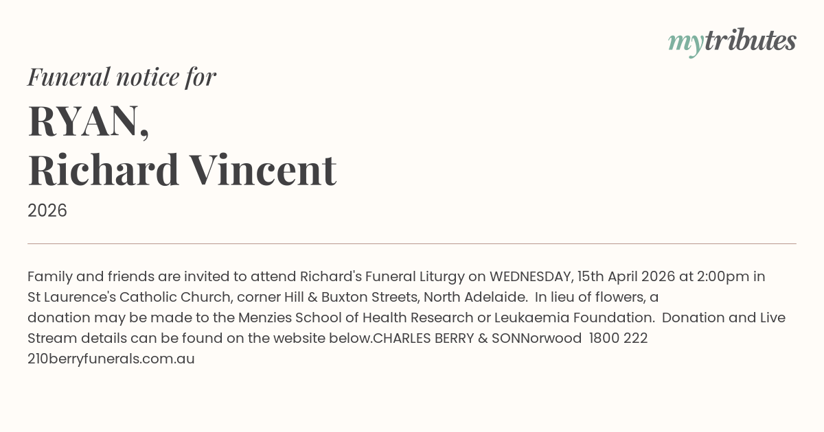 Funeral Liturgy on WEDNESDAY, 15th April 2026 at 2:00pm